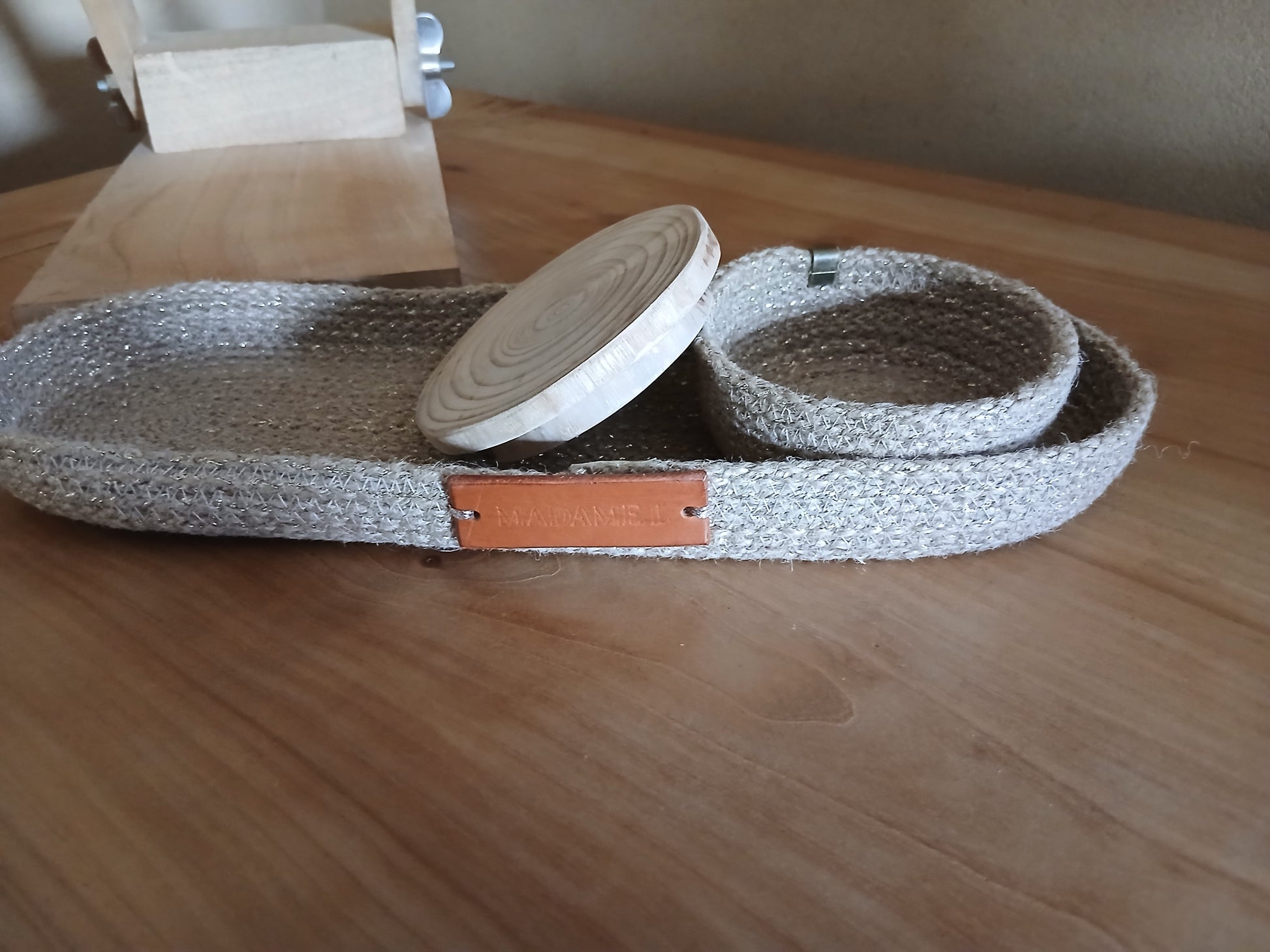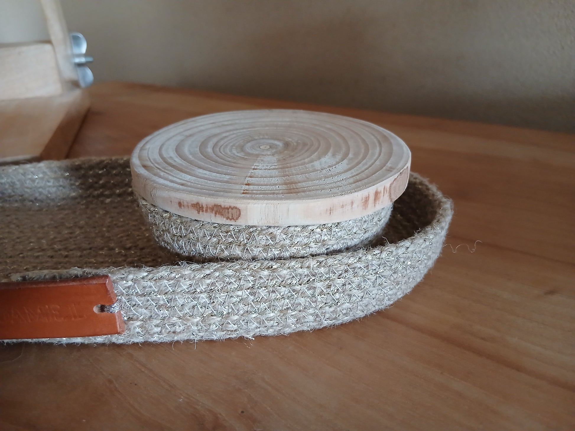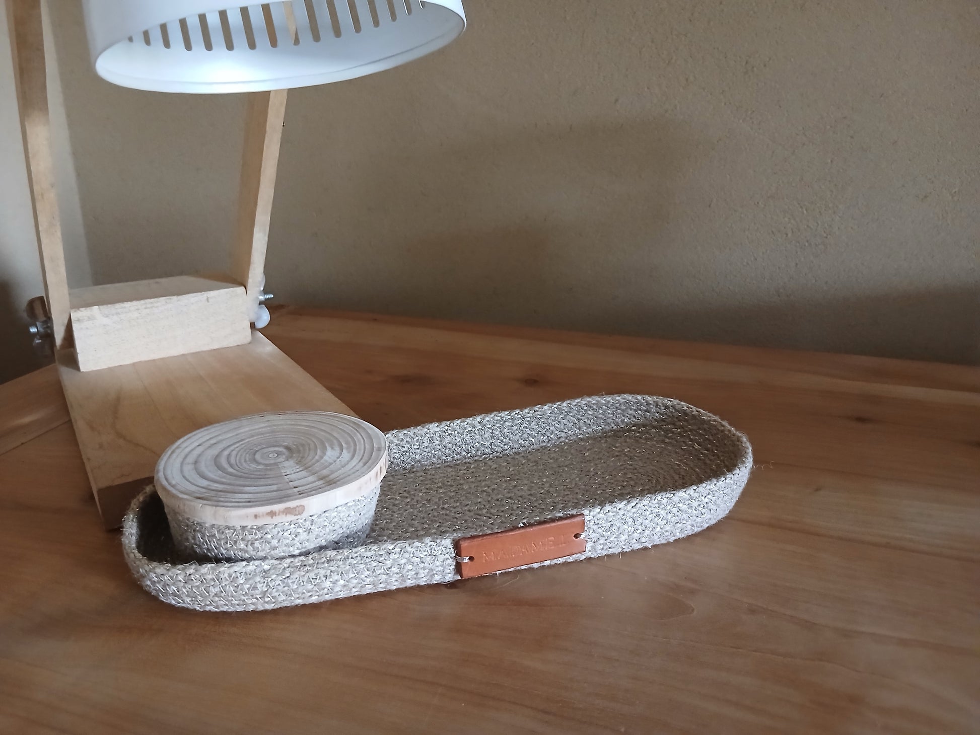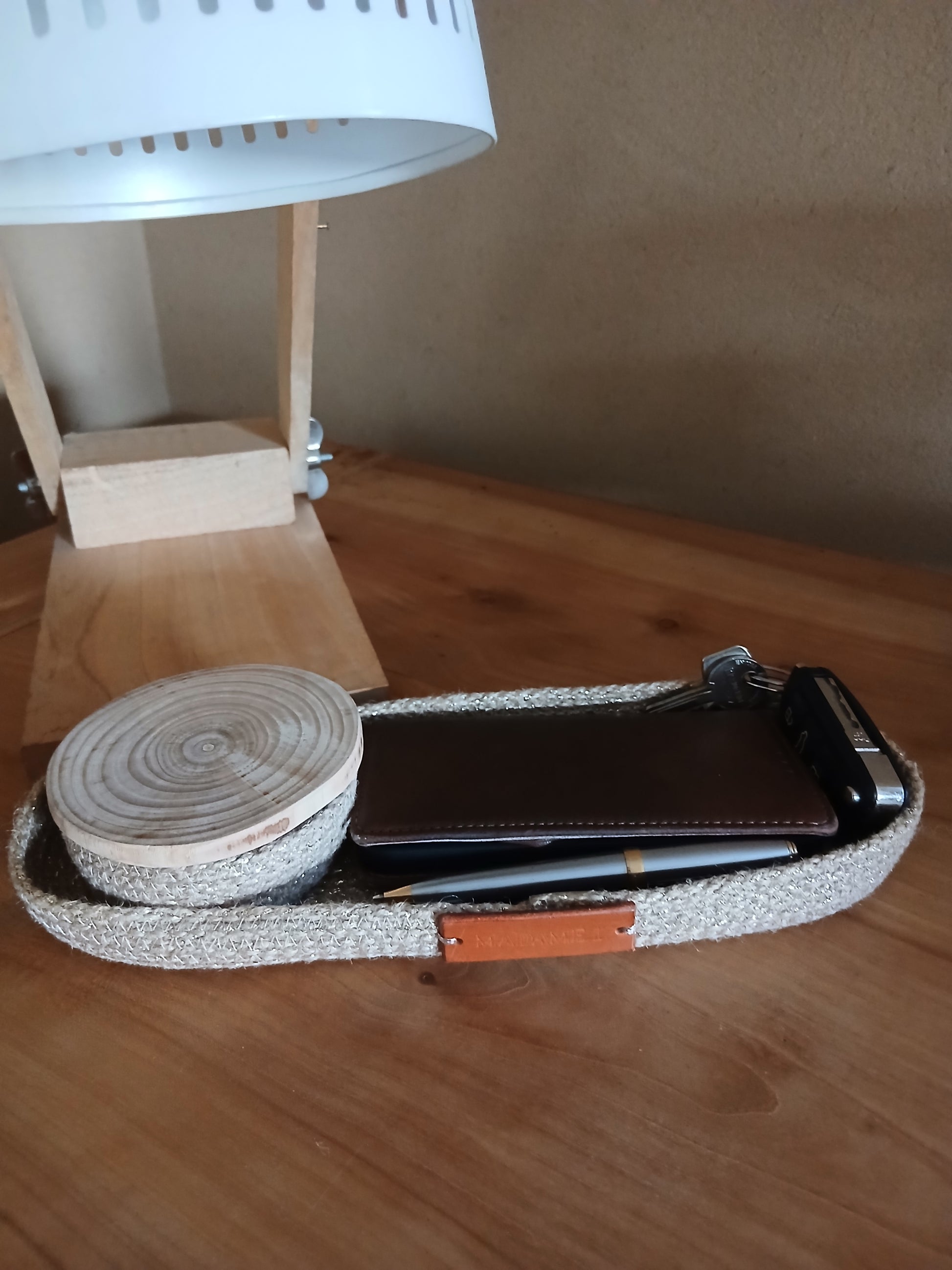 Le petit plateau dépose-tout Madame L. marie la chaleur de la corde de jute à la noblesse du bois brut.