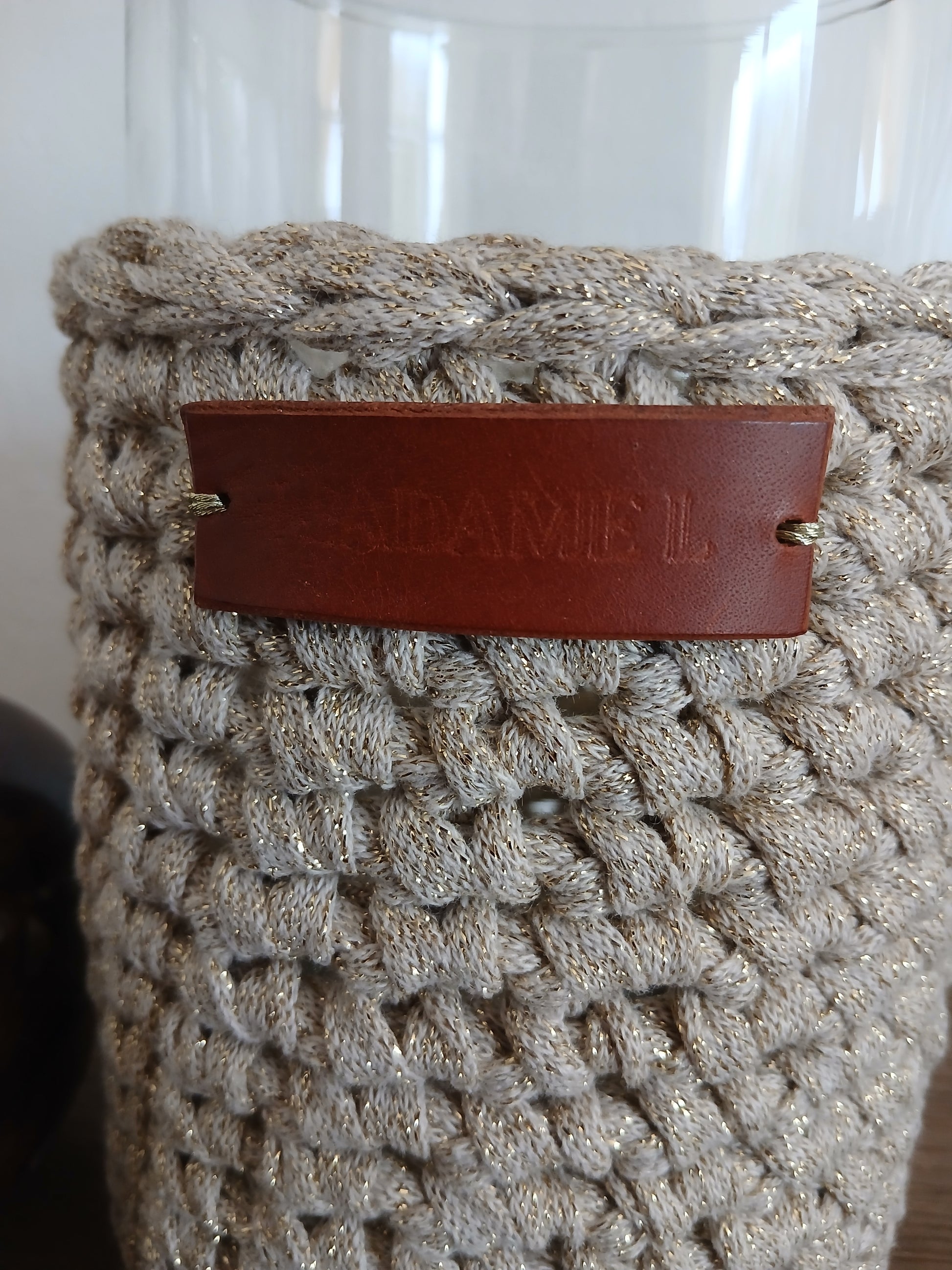 Vase habillé de coton beige aux reflets dorés.